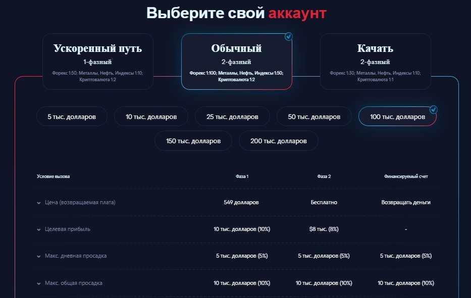Для трейдинга клиентам предлагают несколько аккаунтов. Размер портфеля колеблется от 5 до 200 тысяч. Чтобы получить деньги, нужно пройти три типа испытаний. Торговать предлагают валютными парами. Можно спекулировать металлами и нефтью. Доступны индексы и криптовалюта. Кредитное плечо зависит от выбранного актива и составляет от 1:1 до 1:100.