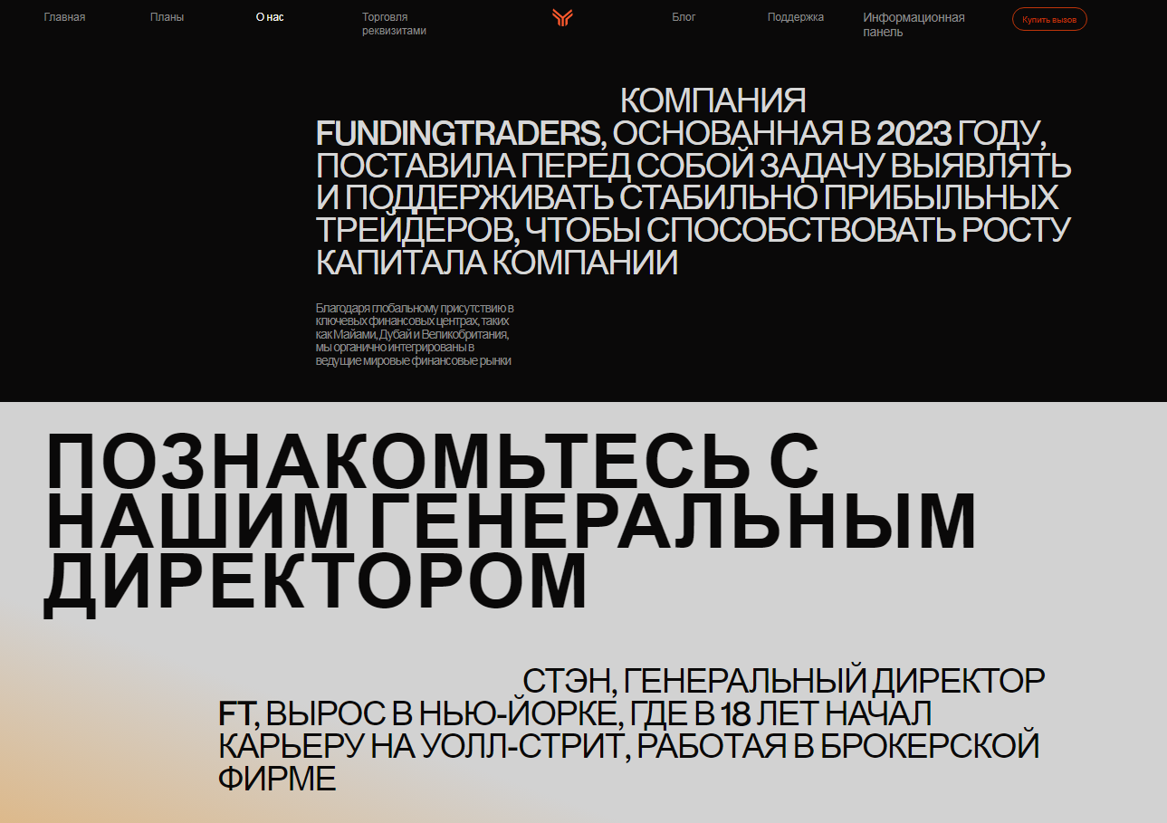На сайте брокера «Фандинг Трейдерс» есть раздел «О нас». В этой вкладке мы узнали, что компания была создана в 2023 году. Сегодня ее директором является некий Стэн, который с 18 лет находится в брокерской сфере. По сути знакомства с проектом и его истории нет. Службе поддержки тоже особого внимания не уделили.
