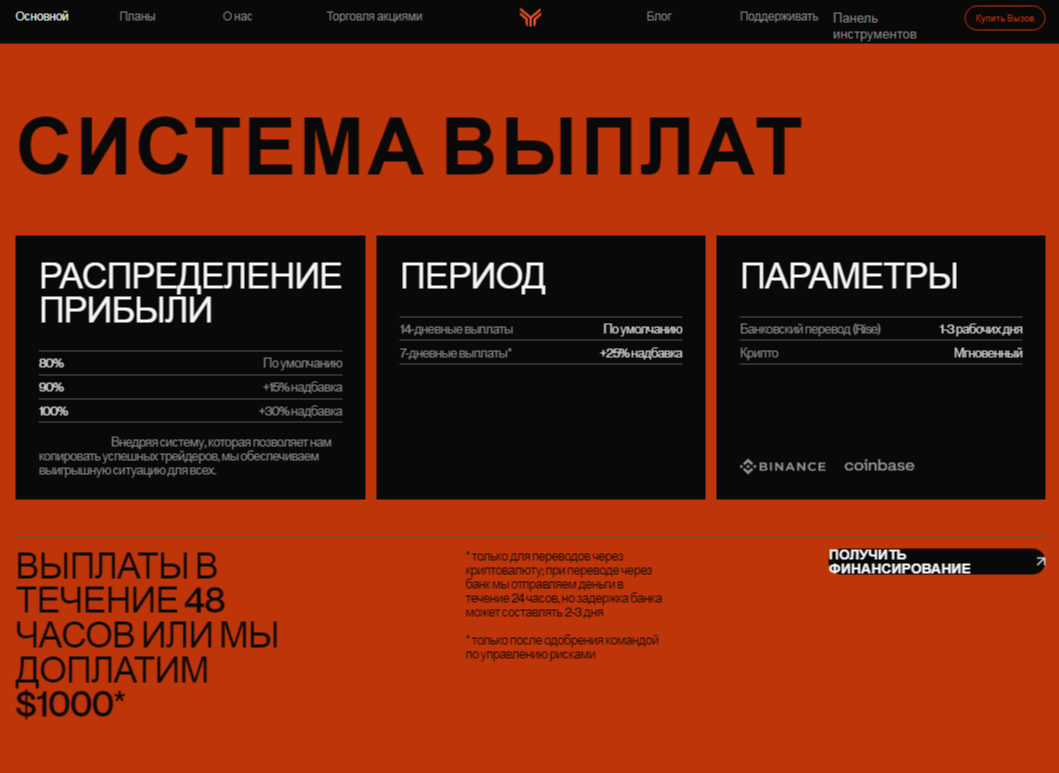 На официальной странице брокера fundingtraders com встречается информация о том, что здесь 100% разделение дохода и выплата средств в течение 7 дней. Однако ниже условия намного привлекательней. Якобы прибыль приходит в течение 48 часов, а если это условие не соблюдается, то клиенту бонусом отправят еще 1000 долларов.