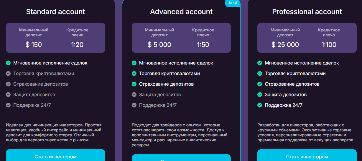 На сайте представлена трехуровневая тарифная модель:- Standard — вклад $150, плечо 1:20;