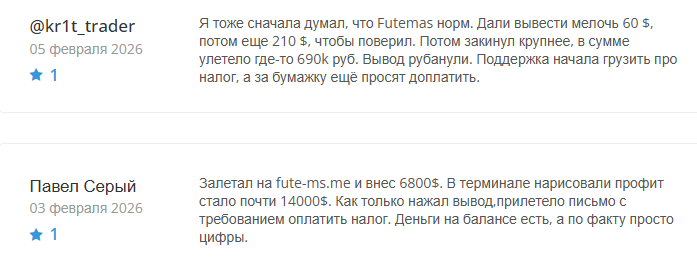 Пользовательские отзывы о работе на https futemas com преимущественно сводятся к жалобам на непрозрачные условия выплат, сложность получения средств и отсутствие фиксированного регламента по финансовым операциям. Подтвержденных положительных кейсов нет.