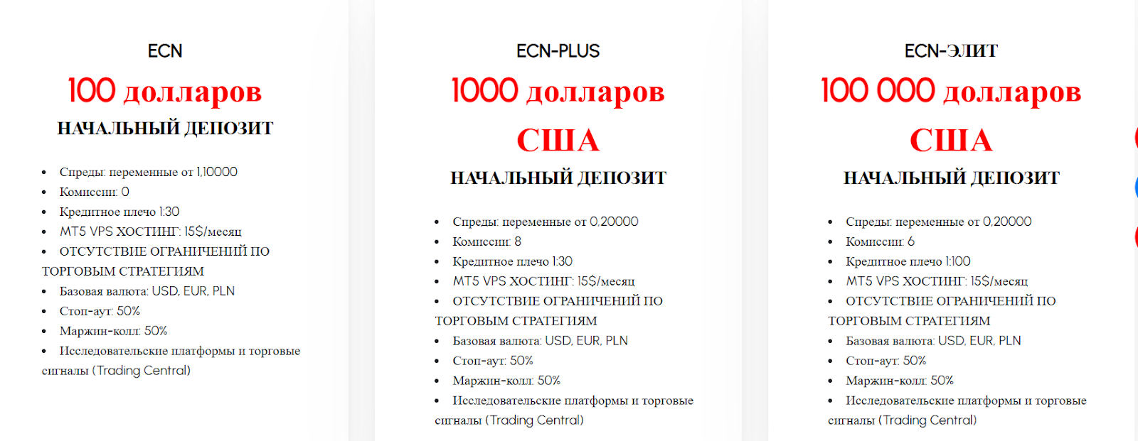 Для стандартного счета минимальный депозит $100, однако для ECN-Plus и ECN-ELITE придется внести по $1К и $100К соответственно. Комиссия на счетах также зависит от их типа. Так, владельцу счета ECN комиссию платить не придется, а ECN Plus и ECN Elite выложат по $8 и $6 соответственно. Также для всех типов счетов трейдерам необходимо заплатить комиссию в размере $15 за VPS-хостинг. Детально о счетах ниже.