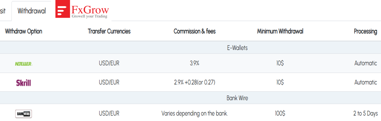 Изучив информацию в сети, мы выяснили, что комиссии за депозиты отсутствуют, но если захотите вывести деньги через электронный кошелек, придется заплатить 3,9%, а это выше чем у других брокеров. Для сравнения, средний показатель у Forex 1-2% в зависимости от размера сумма, которую планируете вывести. Чем выше сумма вывода, тем соответственно меньше будет процент комиссии.