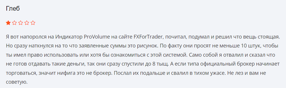 На сторонних ресурсах нет положительных отзывов о «Фх Фо Трейдер». В телеграмм-канаде комментарии и реакции закрыты. Поэтому пользователи не могут написать благодарности. Они не могут начать общение сами. В отрицательных отзывах люди пишут, что нашли индикатор ProVolume и решили, что весь стоящая. По словам трейдера, разработчики компании запросили 10 000 рублей. Он не хотел отдавать такую сумму. В результате сторговался до 8 000 рублей. Пользователь утверждает, что если разработчик FxForTraderMaker начал торговаться, то это далеко не брокер.