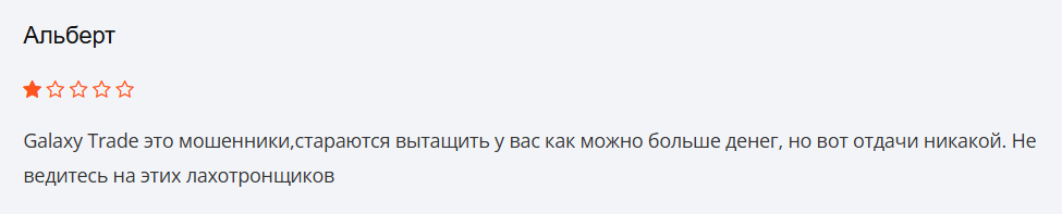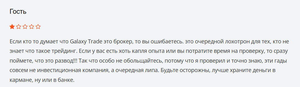 Отзывы о Galaxy Trade official публикуются в открытых источниках, все они негативные. Трейдеры называют сервис мошенническим и не рекомендуют регистрироваться на нём.