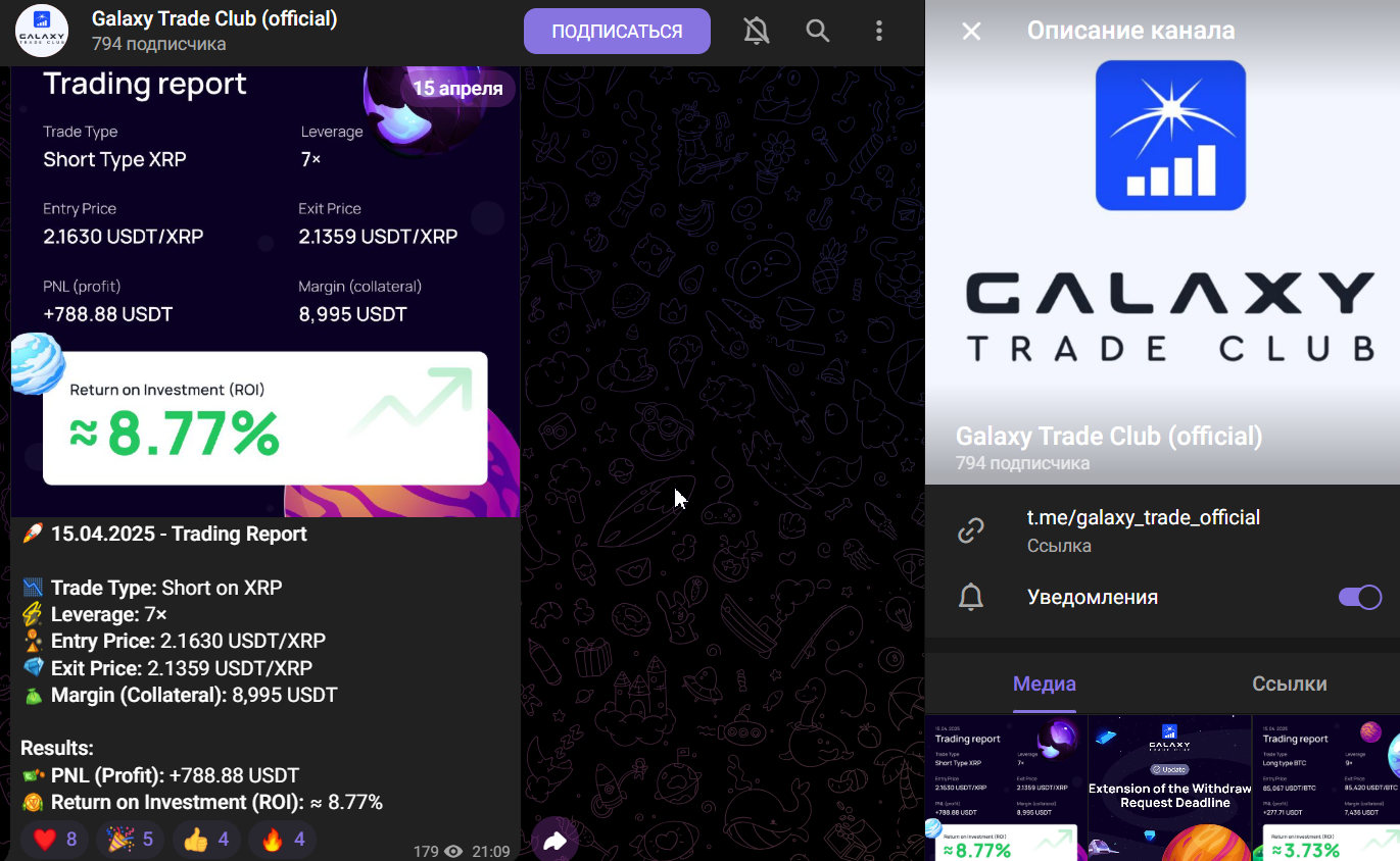Подписчики Galaxy Trade Club не могут комментировать записи. Количество охватов варьируется около 150 и не соответствует общей статистике. Отдельного чата у телеграмм-канала нет, шапка профиля пустая.