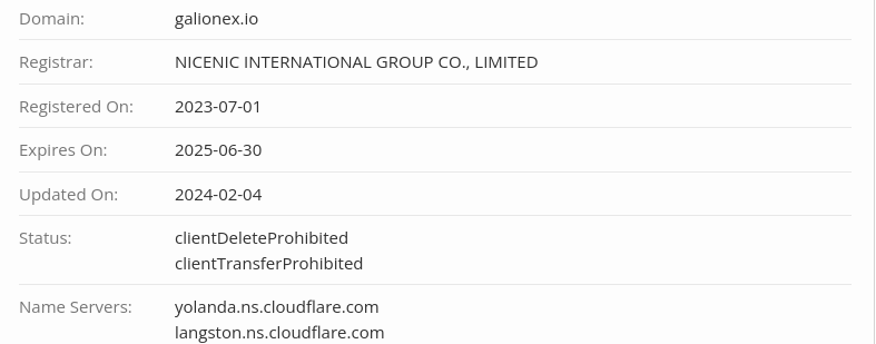 На сайте биржи помимо технической спецификации мы не нашли данных насчет даты создания финансовой компании. Но это для нас не является проблемой, так как в ходе анализа брокеров мы используем WHOIS. Итак, проверка galionex io показала, что платформа по инвестициям существует с 01.07.2023 года.