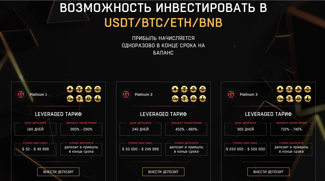 - Platinum 2. Стоимость — от 50 тысяч долларов. Прибыльность до 480%, а срок депозита 240 дней.