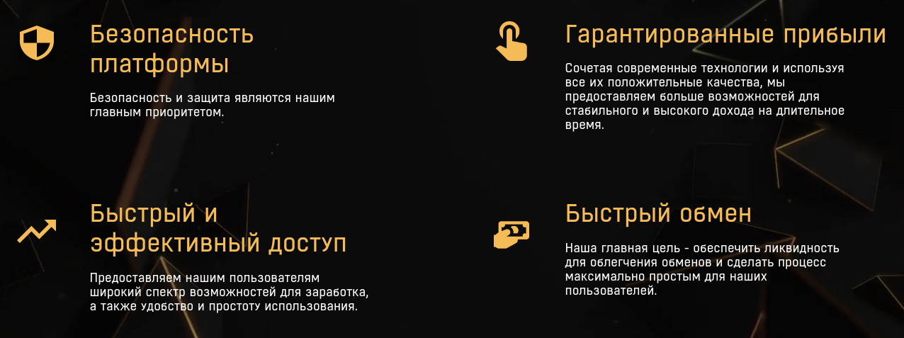 Во-первых, разработчики заявляют про гарантирование дохода. Во-вторых, упоминаются следующие аспекты: