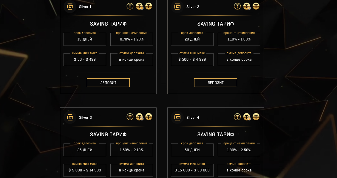 - Silver 1. Срок — 15 дней, начисление до 1.2% в день. Стоимость — от 50 долларов.