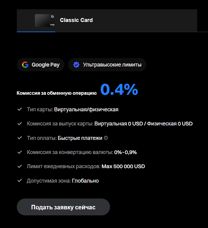 Classic Card гарантирует ультравысокие лимиты до $500,000 в сутки, комиссия за конвертацию токенов в фиат – 0-0.9%. Сервис не берет плату за выпуск физической или виртуальной карты, ее можно использовать без ограничений по гео.