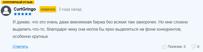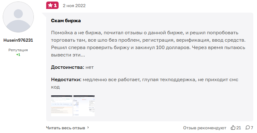 На платформе «Отзовик» мнение пользователей о бирже отрицательное. Husein976231 рассказал о медленной работе терминала, некомпетентных менеджерах поддержки.