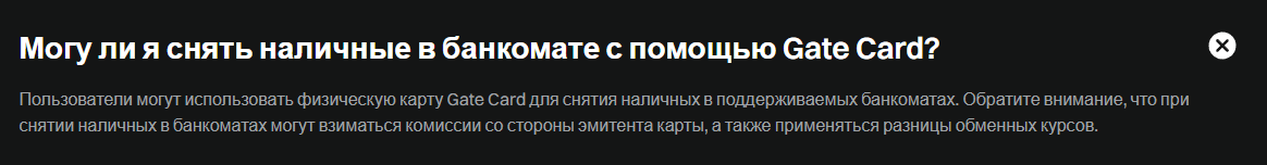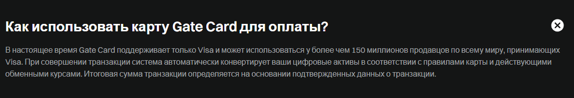 Gate Card – это кредитная карта, которой можно оплачивать товары и услуги у аффилированных компаний. Ее можно использовать в торговых точках, онлайн, снимать фиат через банкомат.