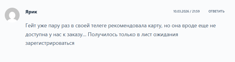 В открытых источниках удалось найти единственный отзыв пользователя о карте Gate. Юзер по имени Ярик написал, что в Телеграмм ее несколько раз предлагали, но он сомневается, что она будет работать в СНГ.