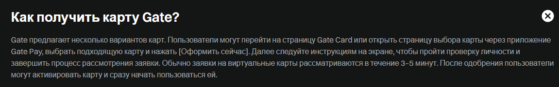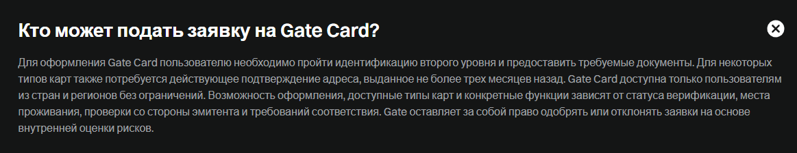 Для подачи заявки на выпуск Gate Card Crypto нужно пройти верификацию аккаунта, предоставив менеджерам пакет документов.
