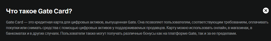 Gate Card Crypto – это виртуальная/физическая банковская карта, которая привязана к криптовалютному счету. С ее помощью можно оплачивать товары и услуги, получать кешбэк за покупки.
