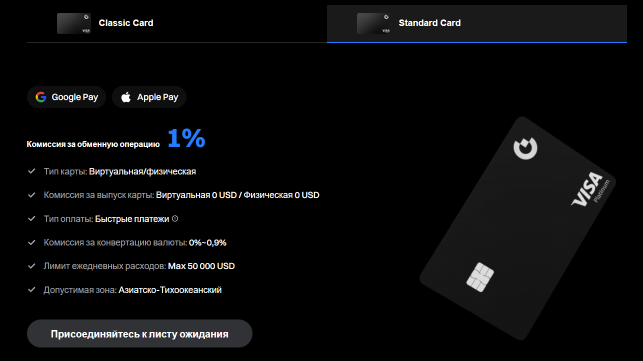 Standart Card создана специально для Азиатско-Тихоокеанского региона. Суточный лимит – $50,000. Сервис по-прежнему не берет плату за выпуск карты, а обменная комиссия составляет 0-0.9% в зависимости от выбранного актива.