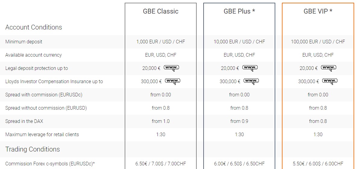 Минимальный депозит у ГБЕ Брокерс составляет $1000, за которые выдается самый простой тарифный план GBE Classic. Тем, кто внесет от $10 000 предлагают более продвинутые планы, в которые включены обсуждения рынка с профессиональными трейдерами, более низкий спред и приглашения на живые встречи.