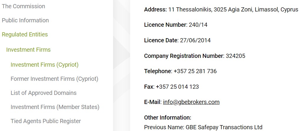 Главный офис GBE Brokers находится на Кипре, в городе Лимасол, также офисы есть в Гамбурге и в Дубае. В этой же юрисдикции он имеет лицензию, выданную регулятором CySEC, ее номер — 240/14. Скорее всего, работа ведется легально.