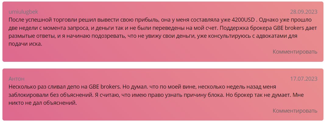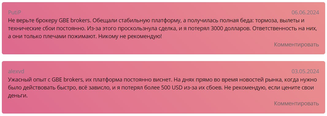 В интернете за годы работы брокера накопилось огромное количество отзывов о GBE Brokers. Встречаются негативные комментарии о том, что торговая платформа работает нестабильно, и это приводит к регулярным убыткам.