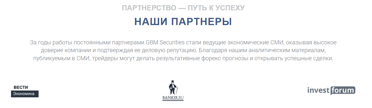 Некоторая информация здесь немного отличается, например, указано, что проект работает уже 14 лет. Но здесь же написано, что проект на рынке с 2008 года. Такие несоответствия в рамках даже одной страницы говорят об обмане со стороны админов. Но проект все же пытается выдавать себя за настоящий Gbm Security, т.к. адрес здесь указан тот же самый.Здесь есть информация о партнерах площадки, их всего три. Среди них СМИ и форумы по тематике инвестиций. Конечно, ни один из этих проектов никак не связан с Trades Gbmsecurities24 Vip.