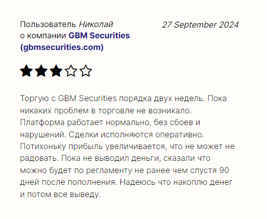 Отзывы о брокере Gbm securities limited противоречивые. Осложняет ситуацию и факт наличия клонов-мошенников, которые, выдавая себя за этот проект, могут навлечь негатив на оригинальный ресурс. В целом, если говорить об официальном сайте, то репутация у него неплохая. Люди отмечают, что успешно сотрудничают с сервисом.