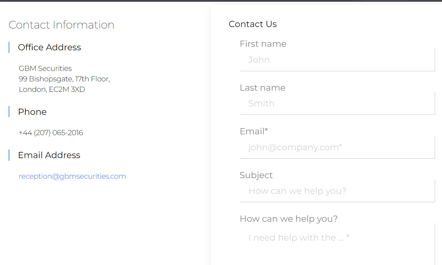 Ниже даже предоставлены физический адрес, номер телефона и электронная почта. Также можно заполнить форму, однако для чего конкретно она предназначена – непонятно. Возможно, после заполнения этой анкеты Gbm security присылают договор инвестора.