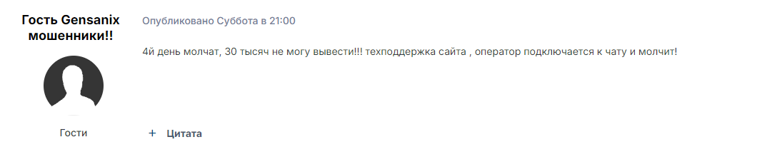 Мы провели поиск отзывов о gensanix com в интернете. Выяснилось, что многим пользователям деятельность проекта кажется сомнительной и нечестной. Некоторые из юзеров отмечают, что платформа не выводит деньги, агенты техподдержки игнорируют вопросы.