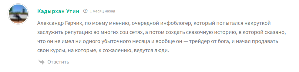 Герчик отзывы об обучении имеет, большинство из которых – негативные. Курс от А до Я Герчика помогает новичкам в трейдинге быстрее освоить базовые навыки в торговле на бирже, а также, по словам на курсе обучения трейдингу от А до Я, получить необходимые знания и практику. Помимо курса, у Герчика есть свои каналы в соцсетях, на которых выкладываются разные материалы по заработку.