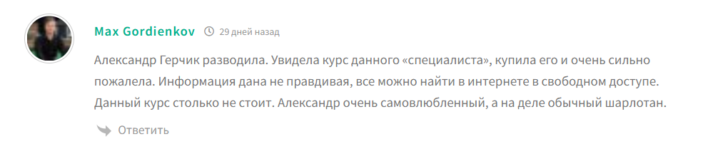 Курсы Герчика это пустышка. Взял информацию из сети а толку ноль. Вместо советов только хвастовство успехами. Деньги потратил зря материал сомнительный. Лучше потратить средства на что то полезное.