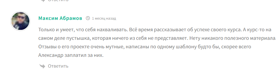 Обучение трейдингу Герчика отзывы в сети уже имеет, однако многие из комментариев именно отрицательные. В отзывах о трейдинге Александра Герчика говорится, что владелец курсов рассказывает только о личных успехах, информация на курсах легко находится в открытом доступе или вовсе не правдива. В отзывах Трейдинга от А до Я также часто упоминается накрутка всех данных на сайте, в том числе и положительных отзывов.