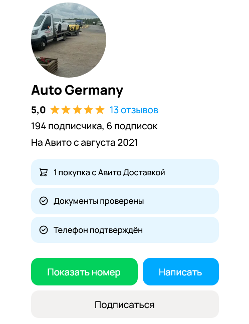 У проекта есть аккаунт на Авито, здесь также размещаются объявления о продаже, а также опубликованы отзывы о канале в Телеграмм Germany Auto. На продавца в ноябре 2025 года подписаны 194 человека, документы проверены, также как и телефон владельца.