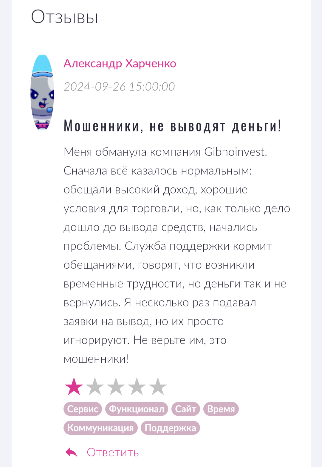 Все же контактные данные помочь выйти на сотрудников или руководство не смогут из-за недействительных электронной почты и номера телефона. Юридический и фактический тоже оставались в тайне, так что, скорее всего, ни к одному из них в действительности брокер не был прикреплен.Критика в отзывах о Gibnoinvest