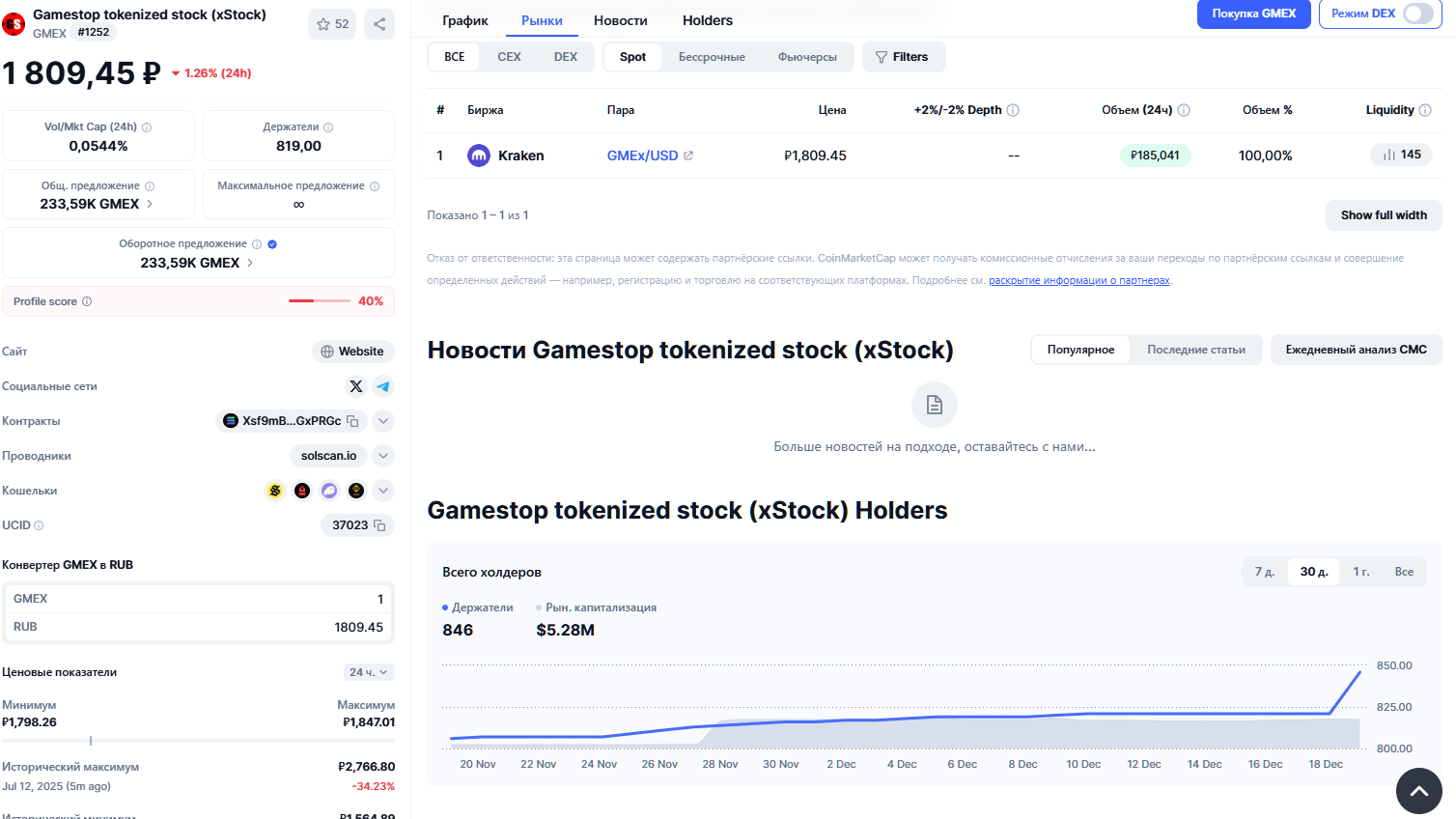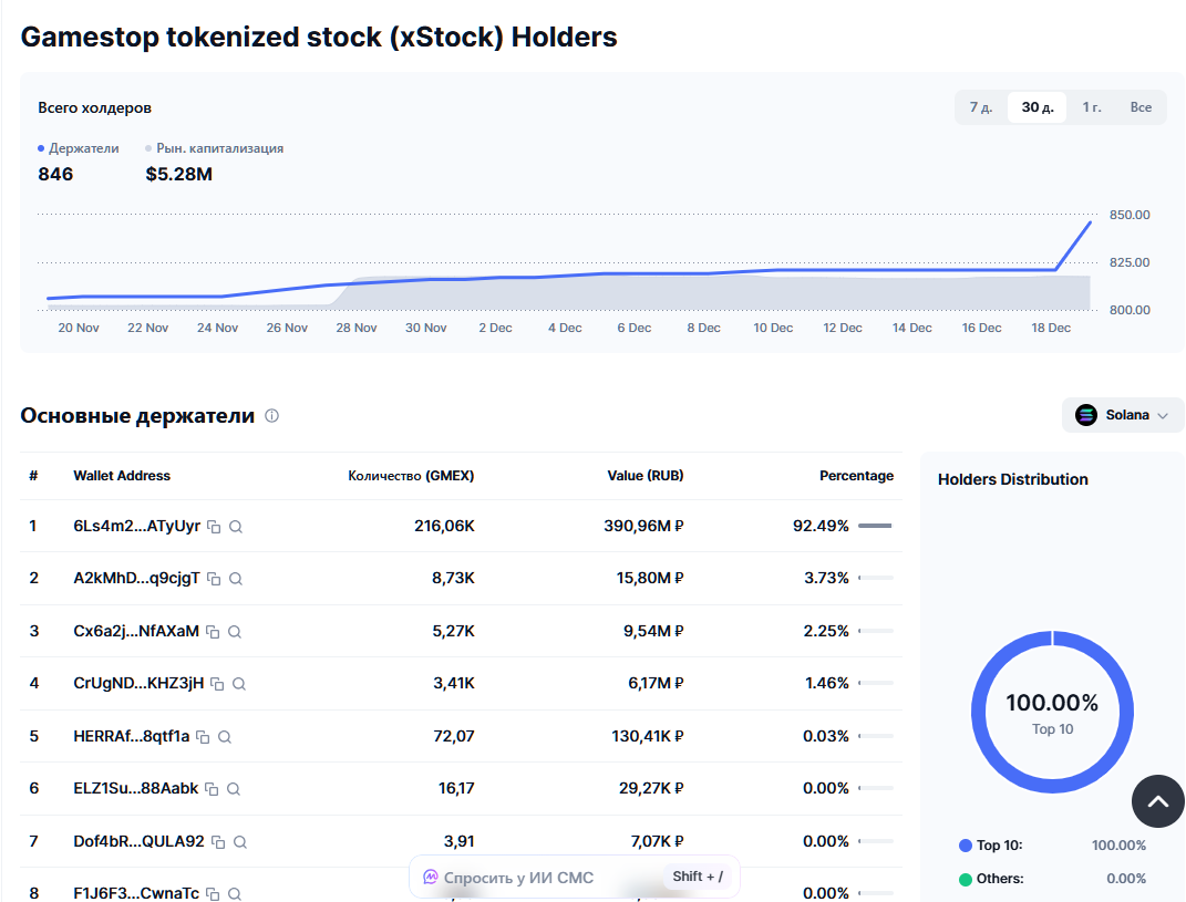 Продать GmeStop сейчас можно только на стоковой платформе Kraken. Заметим, что среди 846 холдеров основная доля монет на одном ккриптокошельке 92.49%. Такая картинка обычно наблюдается перед искусственным повышением стоимости мемкоинов с дальнейшем резким обвалом цен.