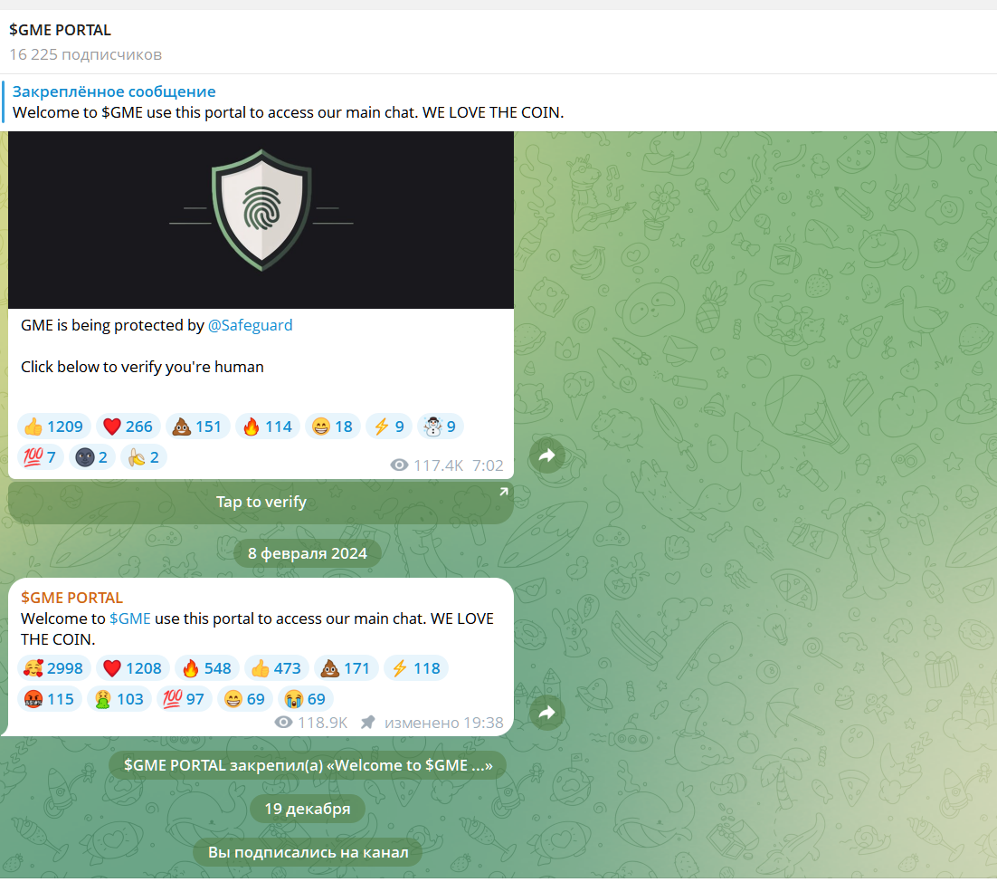 Нельзя сказать, что активность холдеров этого мекоина высокая. Хотя на официальный ТГ канал GME PORTAL подписано 16 225 человек, здесь размещено с января 2024 года всего два поста.