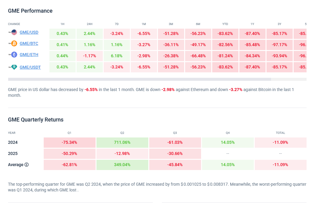 GME криптовалюта запущена в январе 2024 года. GameStop — мем токен на Solana. На декабрь 2025 года стоимость токена около 0.0005 – 0.0006 USD. Капитализация монеты 112.21 миллион, в обращении сейчас находится 6.85 миллиардов монет. Токен торгуется на всех крупных биржах, таких как MEXC, CoinEx, Bitget. Сейчас монета находится на 377 месте в рейтинге.