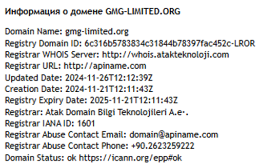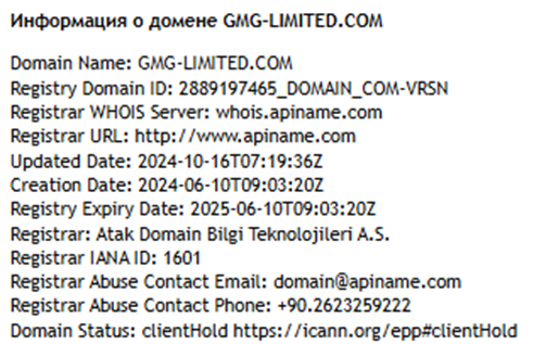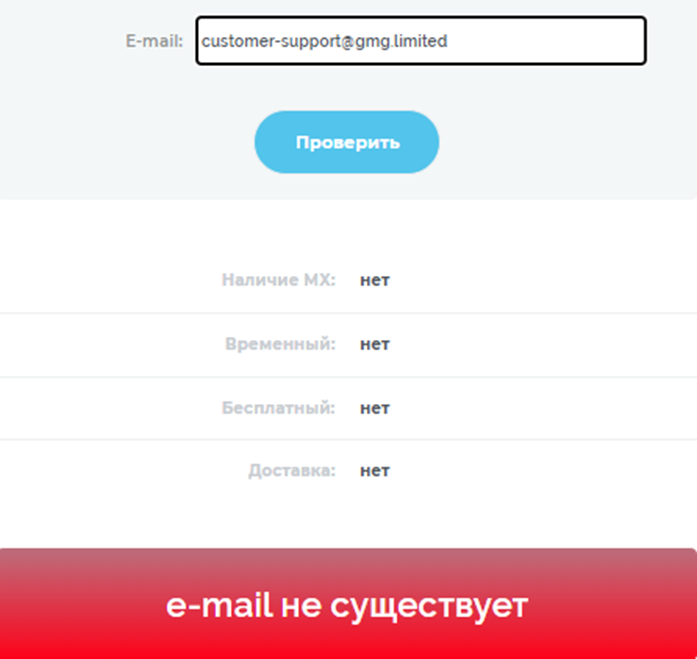 Первый из перечисленных сайтов, Gmg Limited Com, запущен в середине октября 2024 года, а два последних – в конце ноября 2024 года. Пользователям предоставляется информация о службе поддержки, которая якобы доступна по электронной почте: customer-support gmg limited. Проверка показала, что такой адрес не существует.
