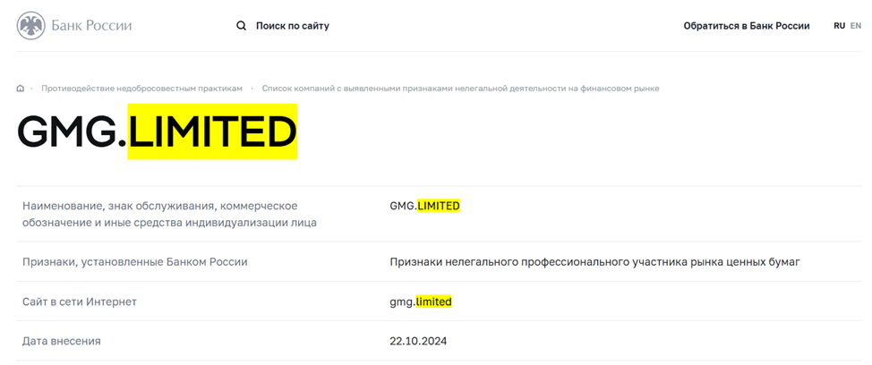 Проверка компании Gmg Limited через сайт Банка России показала, что у брокера отсутствует необходимая для работы на финансовом рынке лицензия. Регулятор 22 октября 2024 года уже внес данного участника рынка в список нелегальных.