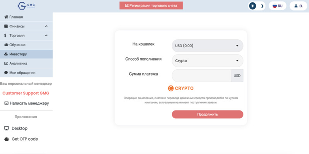 Единственный способ пополнения счета User Gmg Limited Org – через криптовалютный перевод. Никаких сведений о порядке действий при выводе средств, наличии лимитов, сроках таких операций нет, размеры комиссий и других сборов не обозначены.