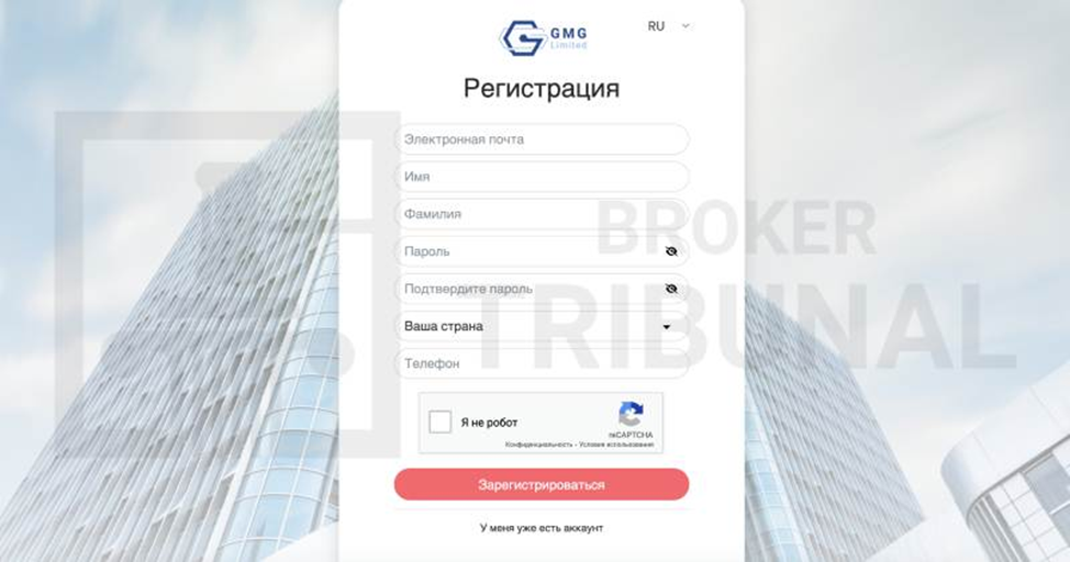 Сайты Gmg Limited носят закрытый характер. Чтобы получить хоть какую-то информацию, необходимо зарегистрироваться. Есть возможность выбрать русский язык интерфейса. Для прохождения регистрации необходимо сообщить о себе: