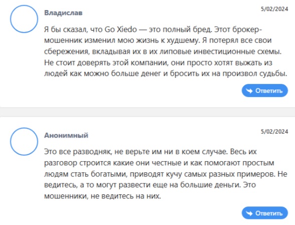 Стоит начать с того, что практически все отзывы о Go Xiedo Co имеют отрицательный оттенок. Некоторые клиенты недовольны обслуживанием. Кто-то заявляет о том, что сотрудники брокерской компании предлагают клиентам провальные инвестиционные схемы. Есть и те, кто открыто обвиняет брокера в мошенничестве. По словам пострадавших, из-за данной организации они потеряли все свои сбережения.