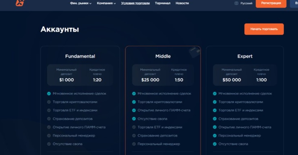 После регистрации пользователю необходимо выбрать один из трех доступных типов счета – Fundamental, Middle, Expert. Они отличаются минимальным депозитом, кредитным плечом, спредами и другими преимуществами, указанными в таблице.