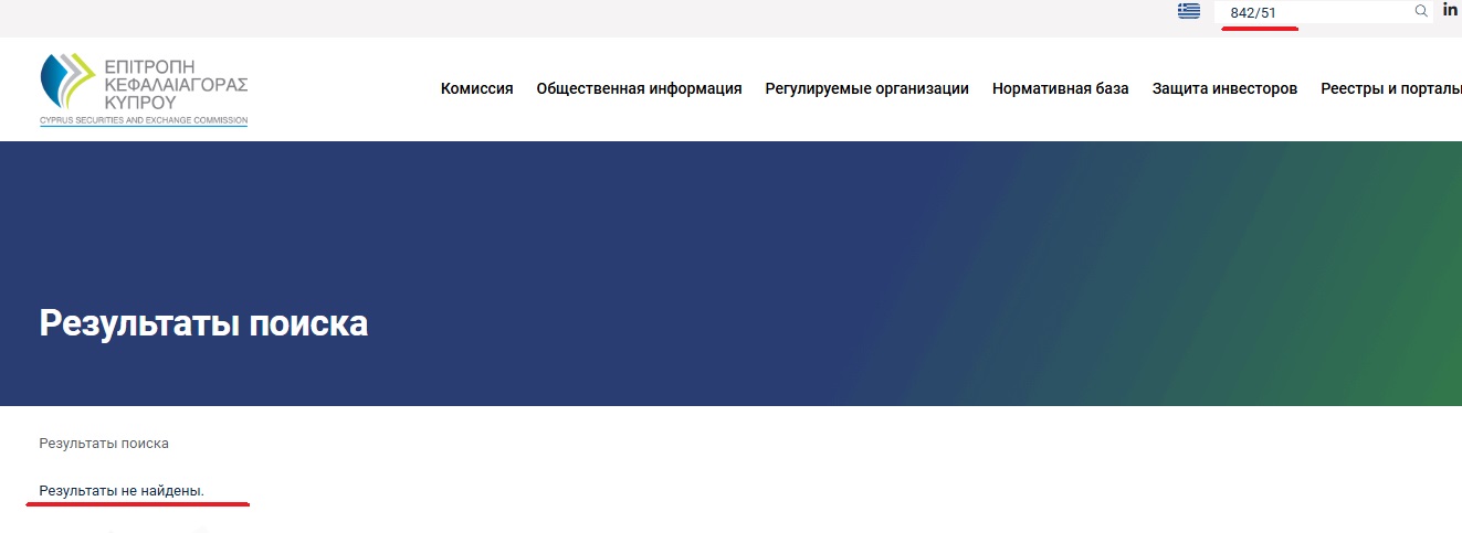 Важно отметить, что свою деятельность брокер ведет совершенно незаконно. Компания никак не регулируется специальными контролирующими органами. На ее сайте можно найти сведения о двух лицензиях от регуляторов Дубая (DFSA) и Кипра (CySEC) – D414201, CIF 842/51. Но проанализировав их, удалось установить, что документы с такими номерами в базе отсутствуют. Таким образом, каких-либо гарантий безопасности для клиентов не существует.