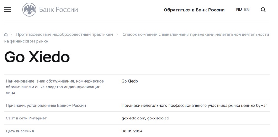 После более глубокого анализа удалось установить, что причиной перебоев в работе доменов являются действия Центрального Банка РФ, занимающегося блокировкой незаконных площадок. Также на сайте Центробанка можно найти информацию о том, что компания «Го Хиедо» имеет признаки нелегальной деятельности.