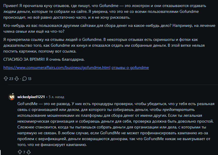 В ответ на такие комментарии пишут про масштаб компании, а также личный опыт, который просто не позволяет подозревать проект в каком-либо обмане. Более того, положительных отзывов о GoFundMe даже на русском гораздо больше, чем отрицательных, причем негативные мнения представляют собой предположения, а не констатацию фактов.