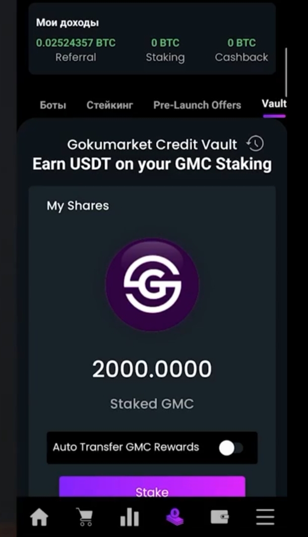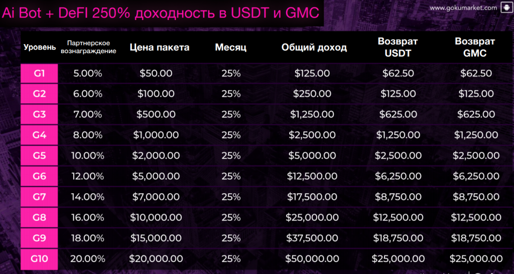 Работа сайта ведётся с многими коинами. Среди них можно найти Binance coin, Bitcoin, Ethereum и другие. Зафиксирован минимальный депозит в размере 100$. Максимальный порог вложений в «Гоку Маркет» — 20000$. Обещанная ставка в месяц — 25% от вложенной суммы.