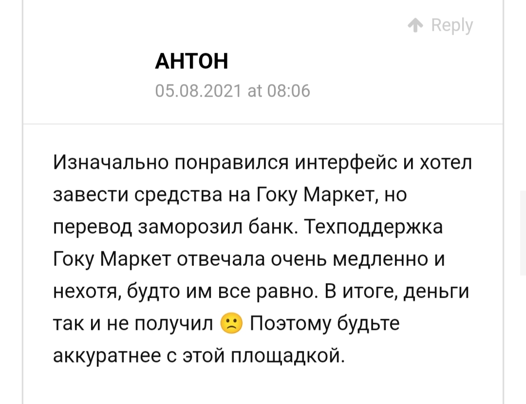 - Проект «Гоку Маркет» ведёт свою работу нелицензированно. Этот факт увеличивает риск обмана с его стороны.