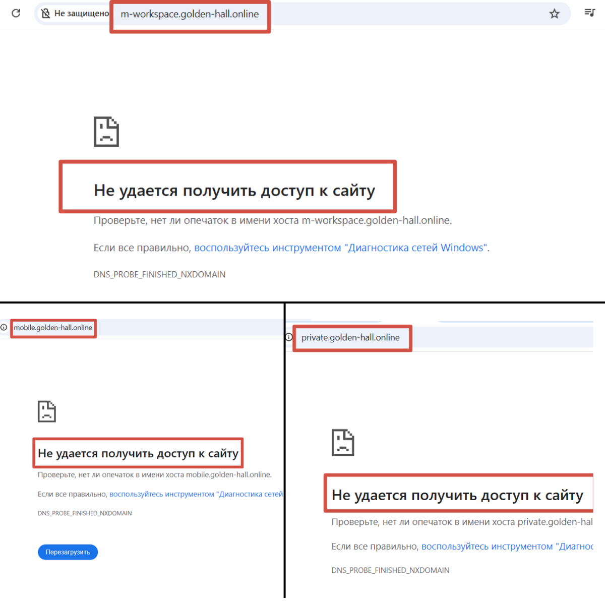Компания имеет множество доменных имен. В написании они отличаются несколькими буквами: golden hall space, mobile golden hall online, m workspace golden hall online и пр. Кроме схожести в написании, у них есть еще одна общая деталь – большинство страниц недоступны, а домены выставлены на продажу.