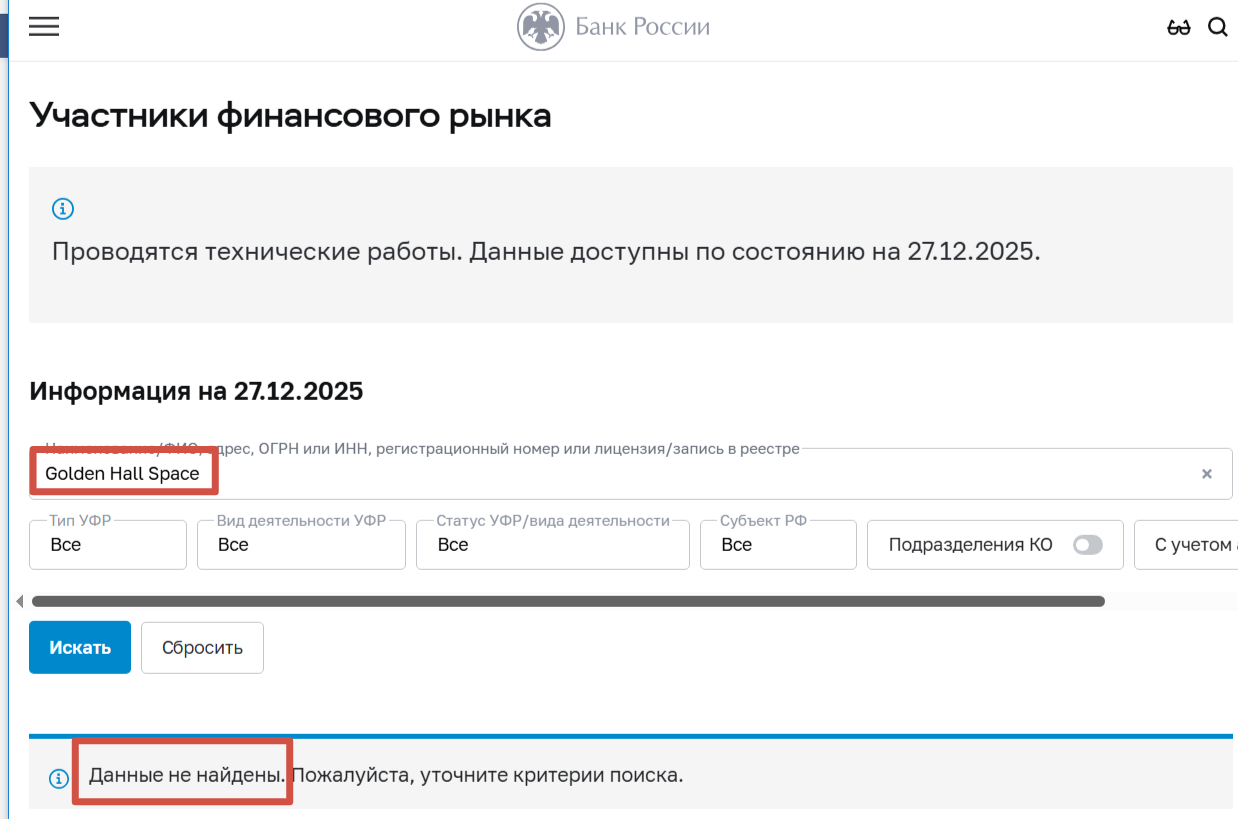 Неавторизованные пользователи лишены даже минимальной информации. Нет сведений о владельцах или регистрационных документов. Зато проверка в реестрах Центробанка РФ показала, что организации с таким именем нет. Это означает, что Golden Hall Space действует в нашей стране нелегально.