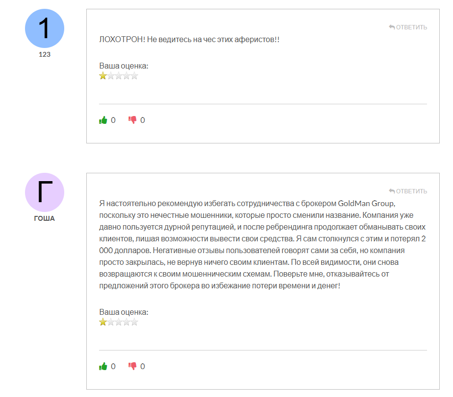 В отличие от информации, отзывов о брокере в Сети сохранилось достаточно. Репутация Goldman Group в них оставляет желать лучшего. Бывшие клиенты прямо называют компанию «лохотроном» и рассказывают о том, как потеряли из-за нее деньги. Некоторые трейдеры также отмечают изначально подозрительные котировки и подрисованные графики.